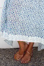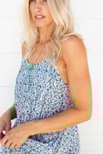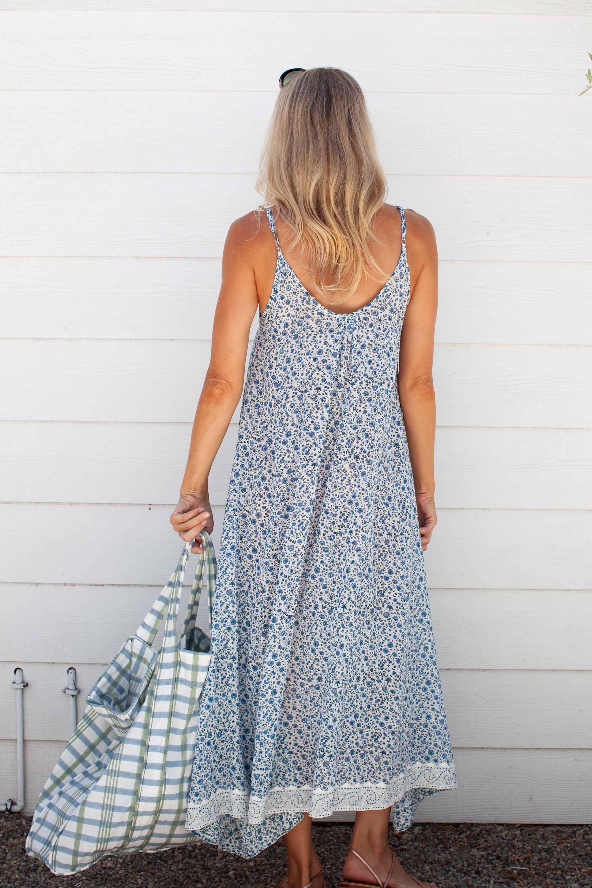 Adjustable spaghetti straps with bodice pleating. Full easy flowing dress with scoop back.