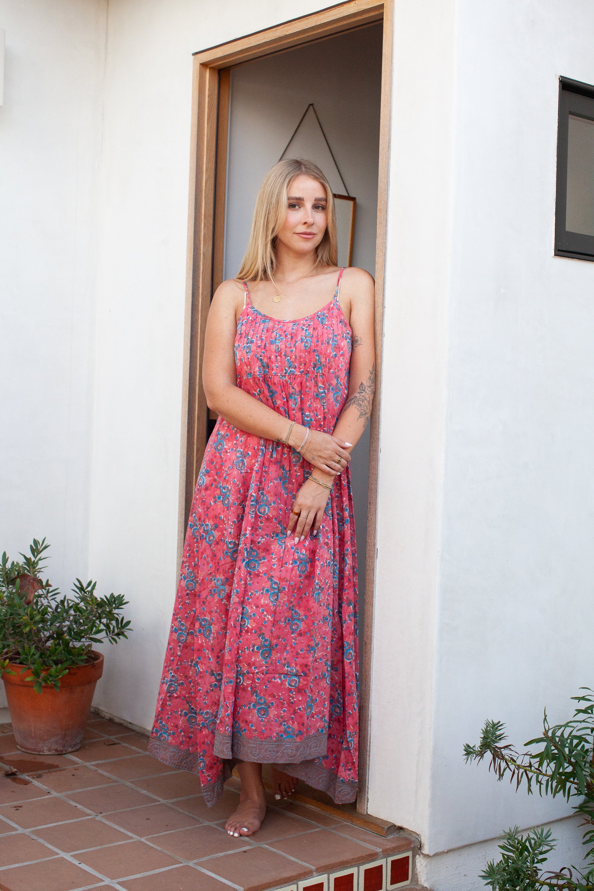 Adjustable spaghetti straps with bodice pleating. Full easy flowing dress with scoop back. Amazing layered with a printed one on top.