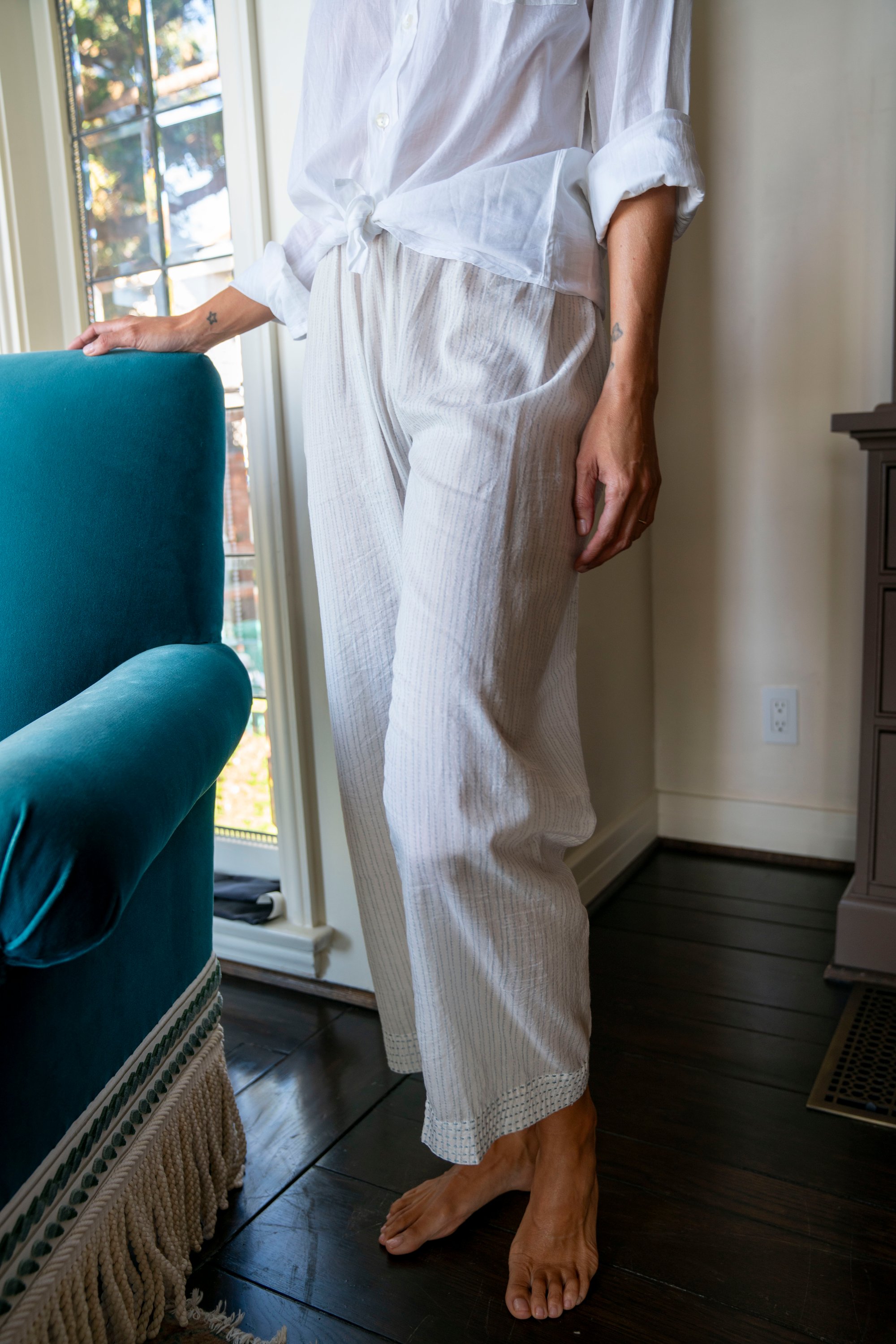 An easy flowing leg and elastic tie waistline make this our classic every day, every night pant. Gudri stitching along hem.