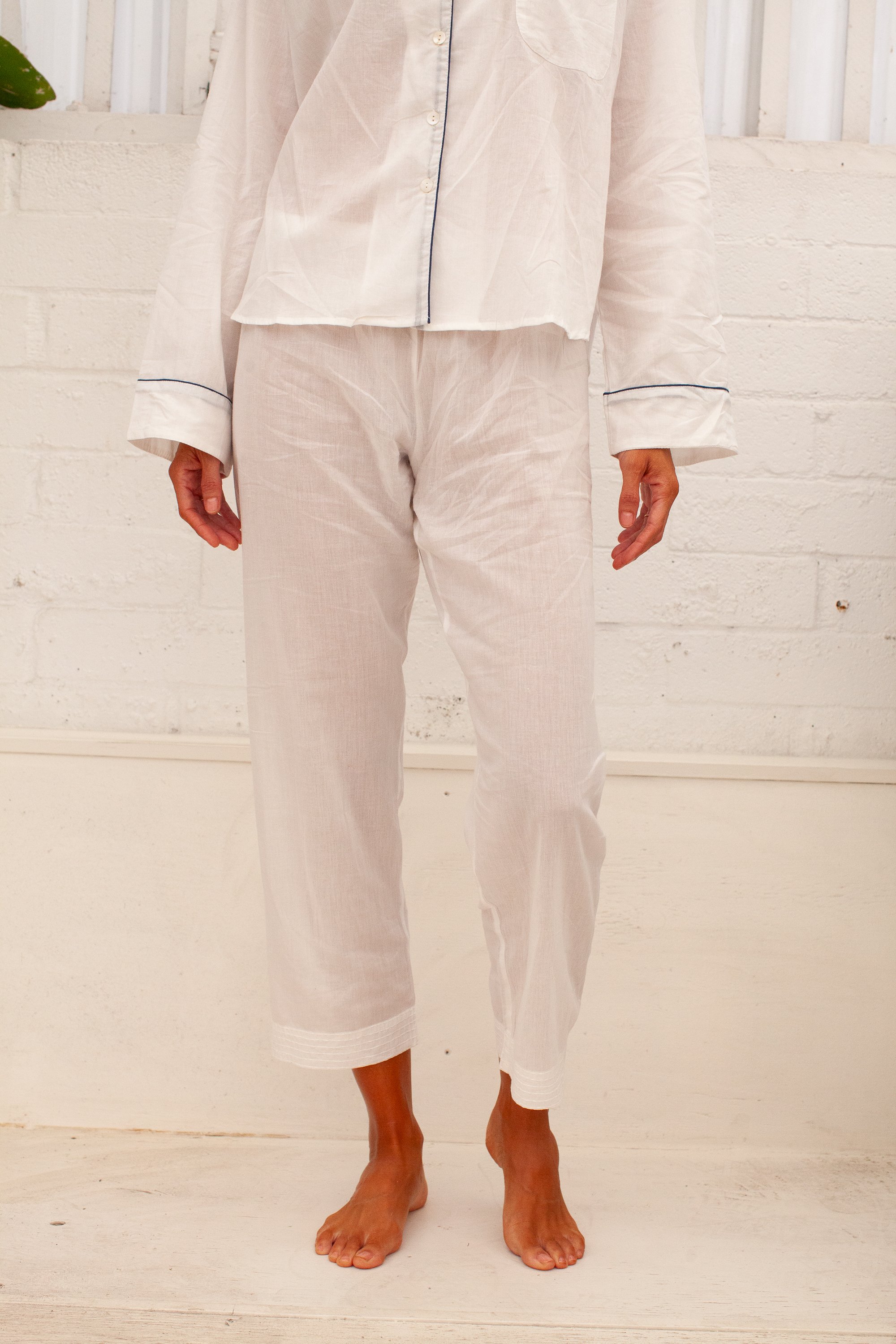 An easy flowing leg and elastic tie waistline make this our classic every day, every night pant. Gudri stitching along hem.
