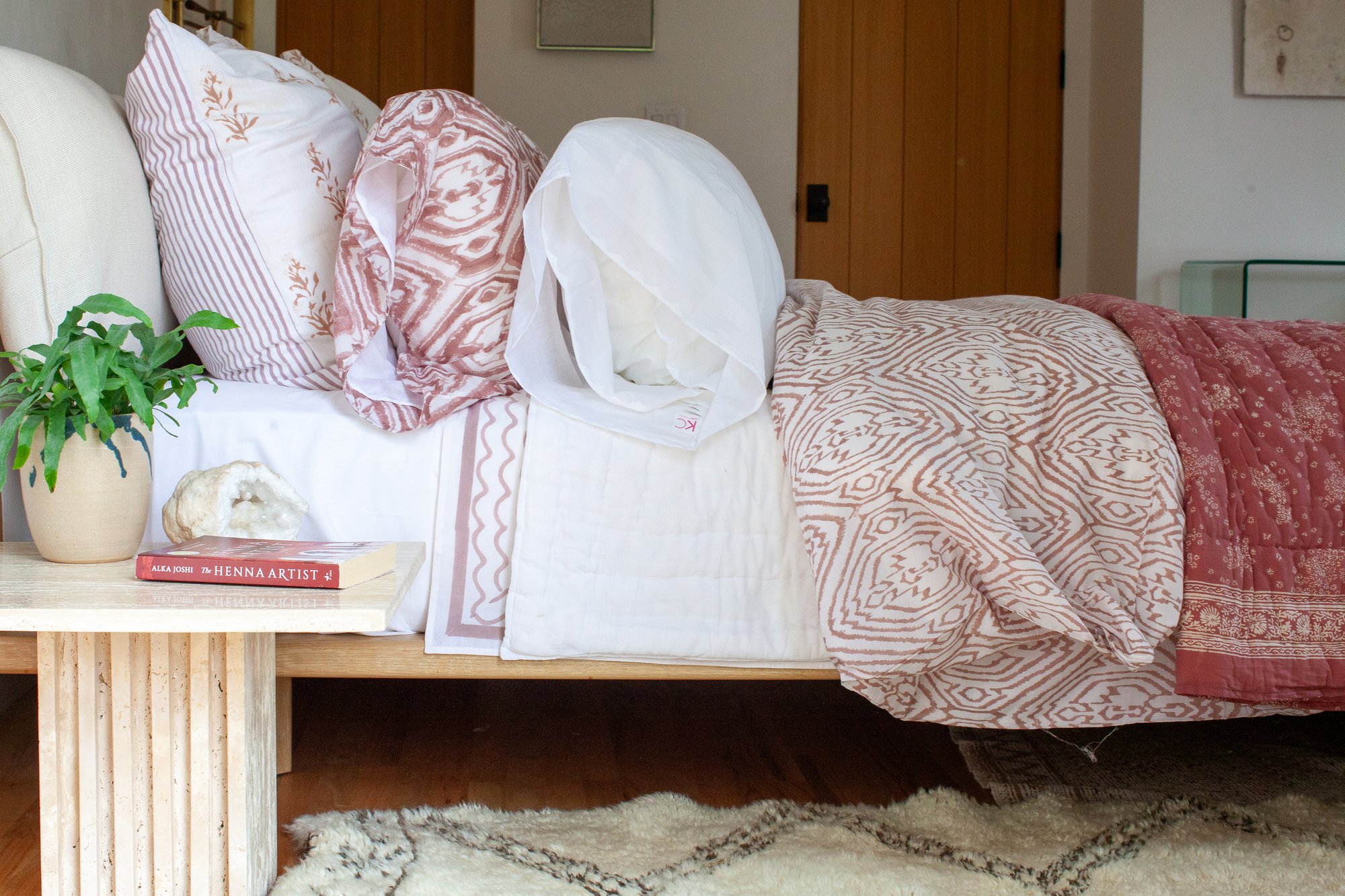 Kerry's quilts include hand-quilted cotton batting, luxe cotton and our softest hem.  We love our solids layered in the bed as top sheets. So snuggly soft.