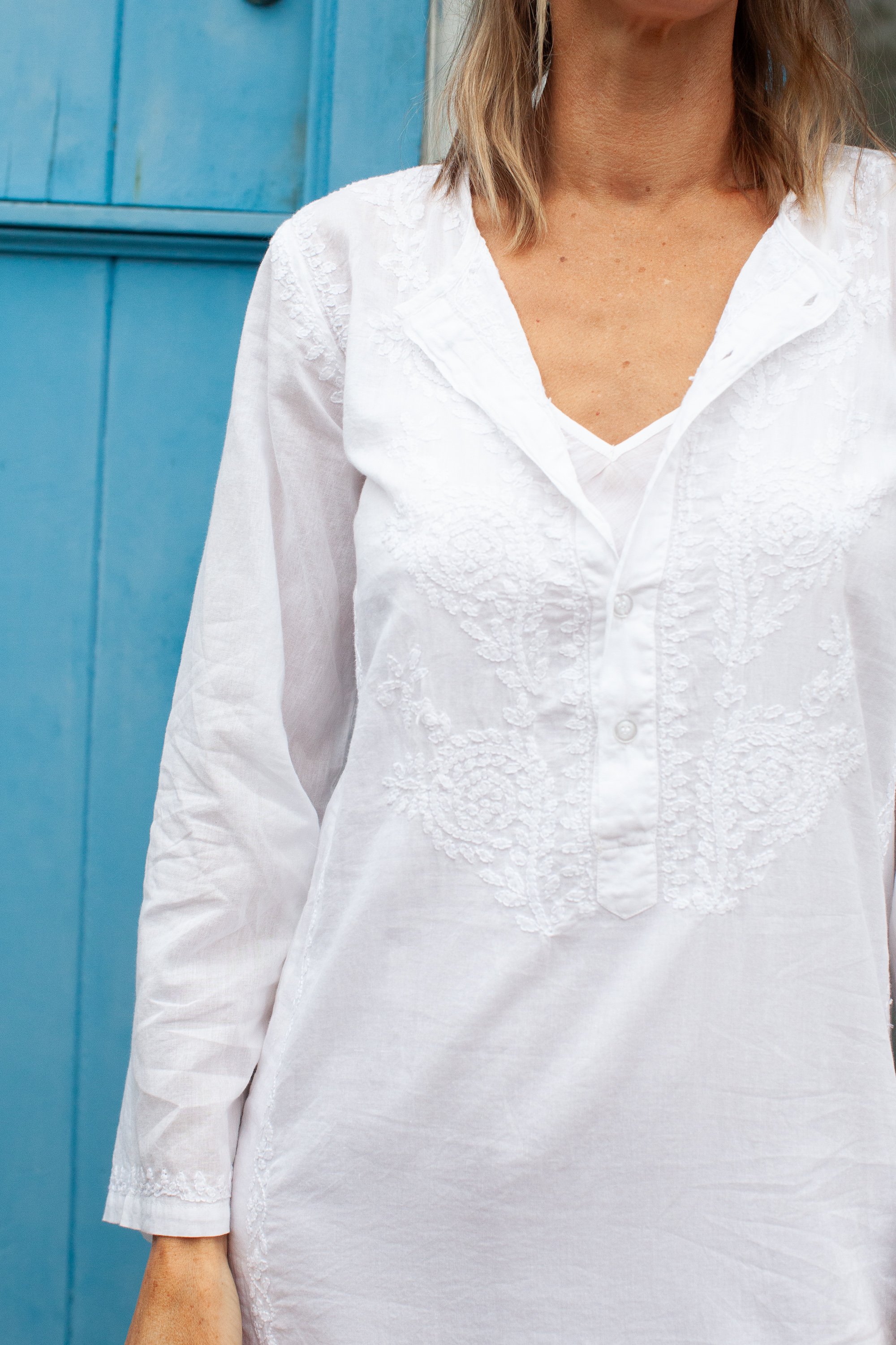 Light weight voile softness embodies our Hand Embroidered Kurta. Beautiful artisanal hand embroidery through the bodice, cuff and hem detail. Button front closure.
