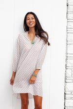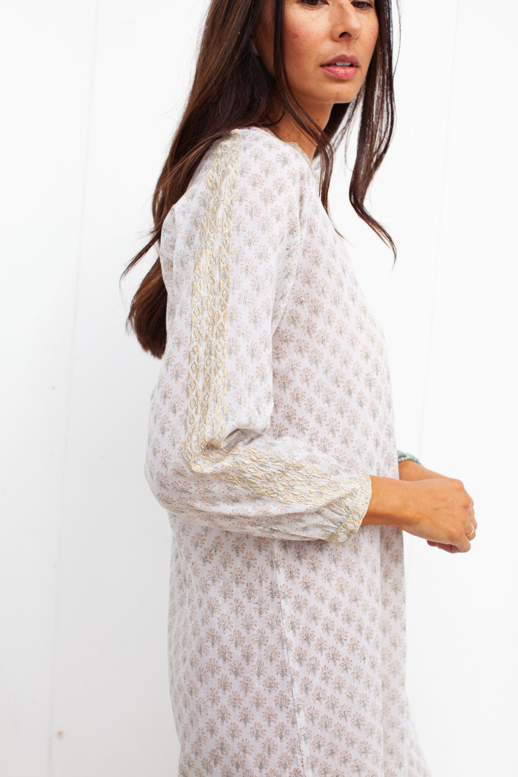 Exquisite machine embroidery detail running down the sleeve. Hitting just above the knee with stitching also around the neckline.