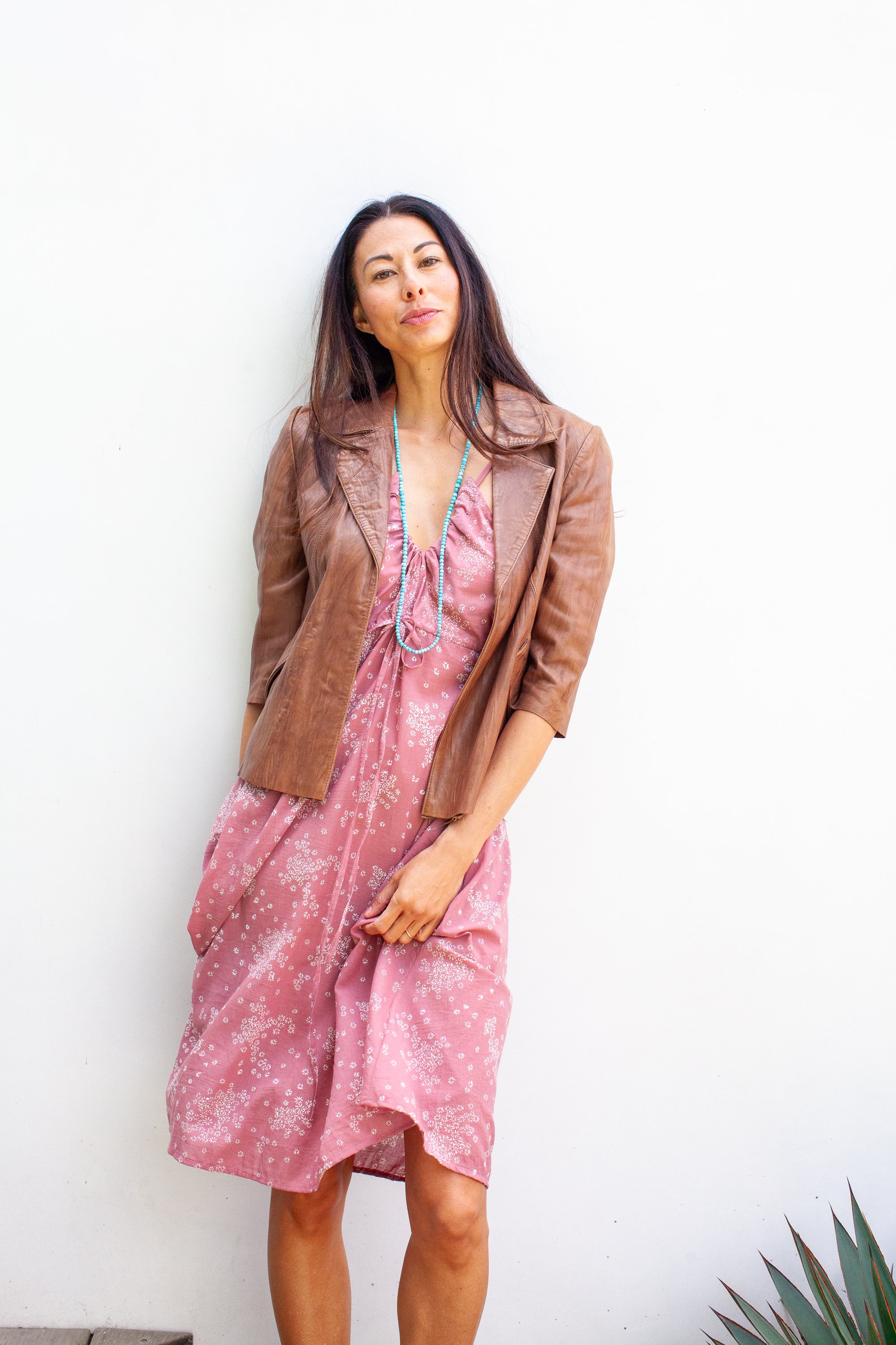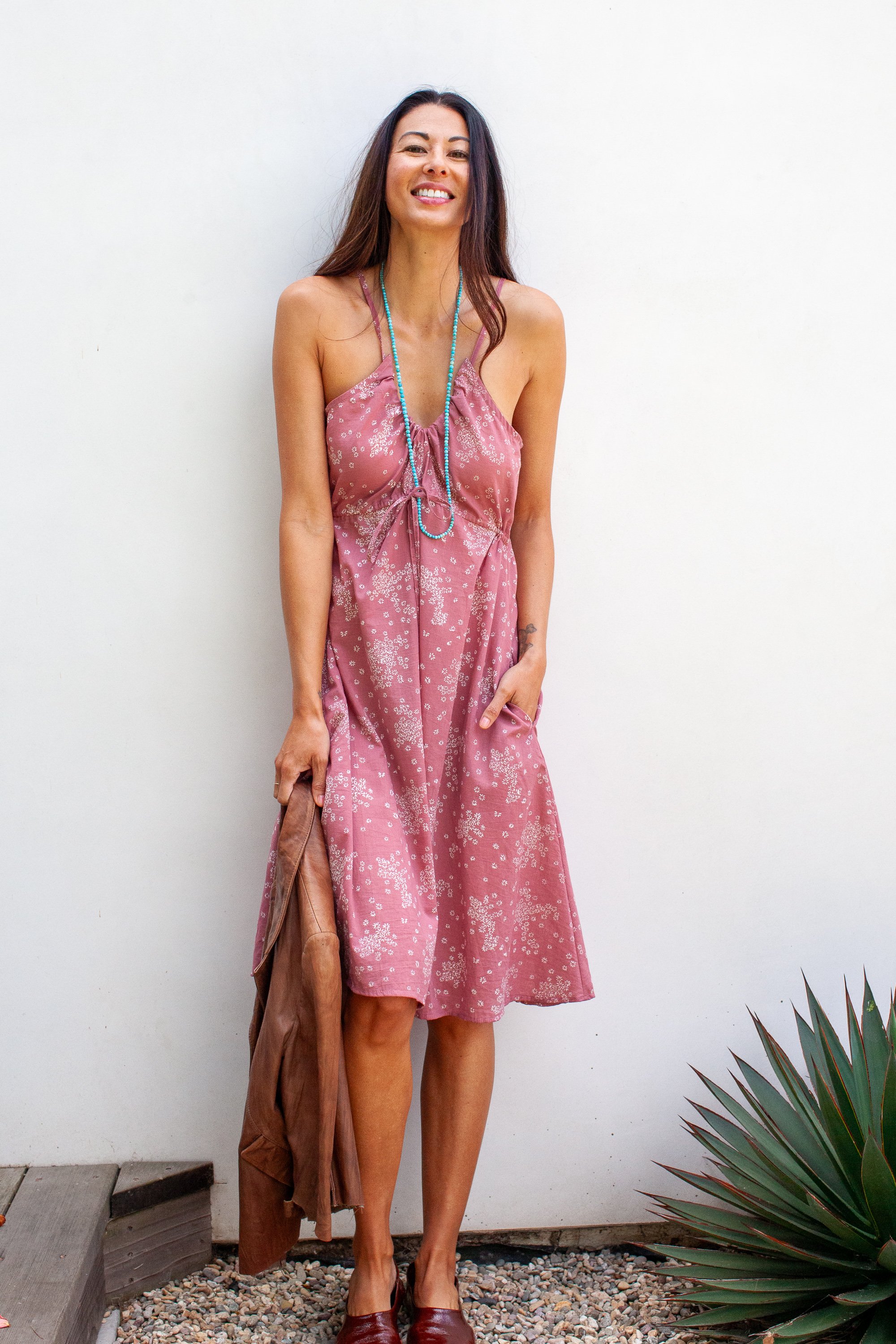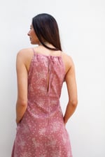 This dress is a soft, feminine midi featuring a delicate hand-block floral print in dusty rose tones. It has thin adjustable spaghetti straps, a flattering gathered V-neckline, and a relaxed A-line silhouette that drapes beautifully. The back features a subtle keyhole opening- adding an airy, elegant touch. Perfect for warm days or layered with a light sweater for an effortless bohemian look.