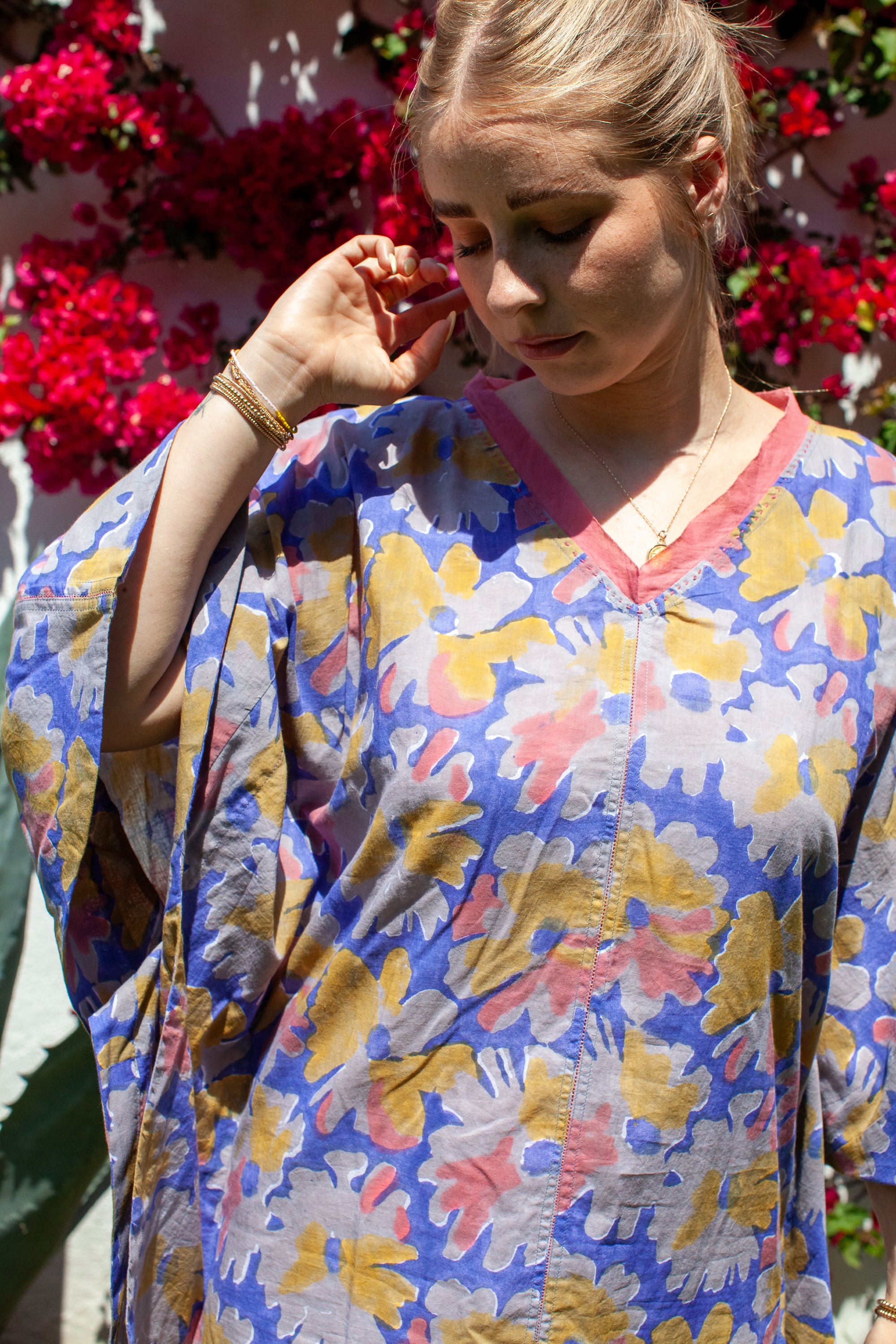 Large oversized kaftan with faggoting detail running down the front. Contrasting trim neckline