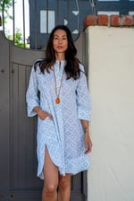 An easy, throw-on tunic with timeless appeal. Designed in our soft hand block print Boxer, this relaxed silhouette features a split neckline, ¾-length sleeves, side slits, and convenient pockets. Lightweight and breathable, it’s perfect for warm days, travel, or effortless everyday wear. Style it loose over sandals or belt it for a more defined look.