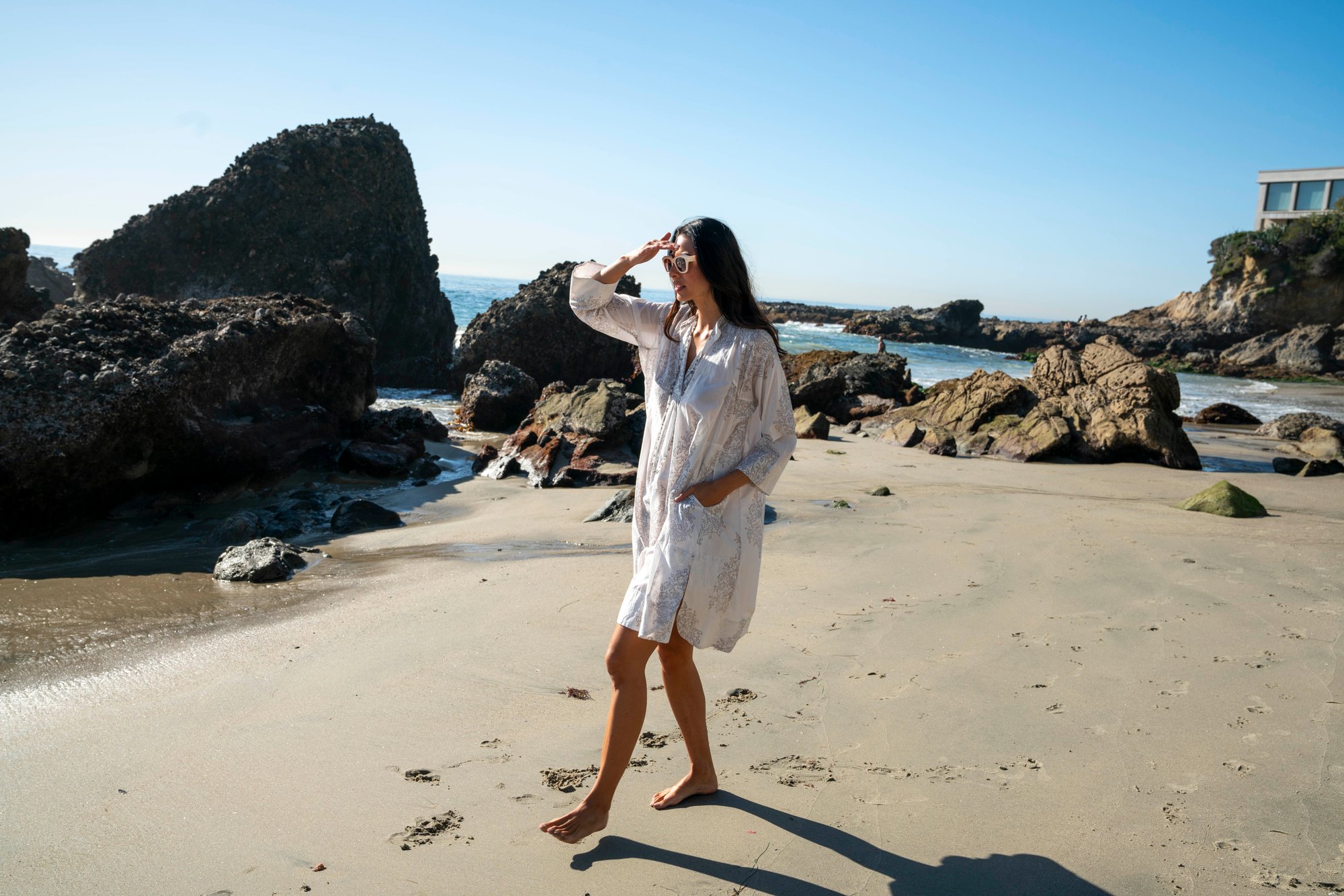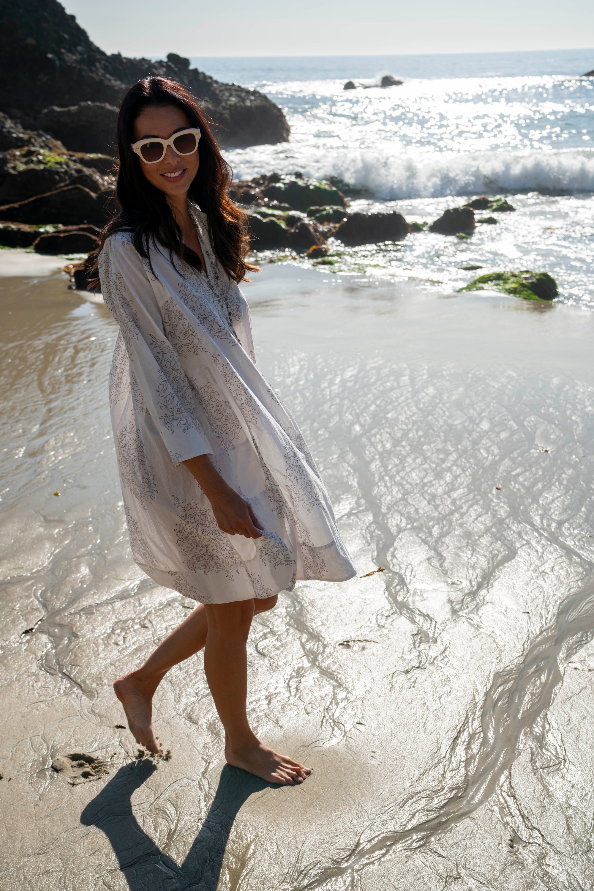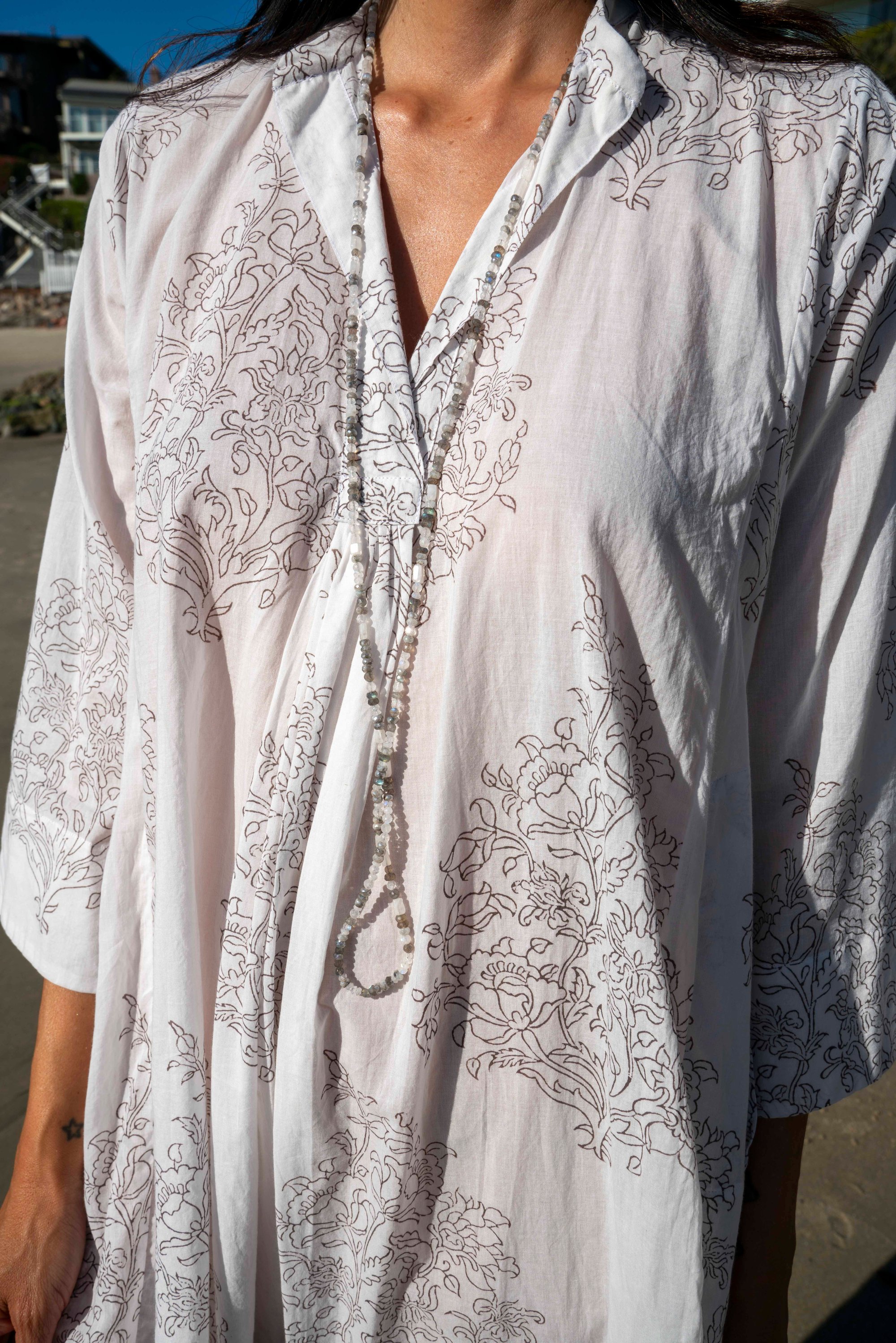 An easy, throw-on tunic with timeless appeal. Designed in our soft hand block print Boxer, this relaxed silhouette features a split neckline, ¾-length sleeves, side slits, and convenient pockets. Lightweight and breathable, it’s perfect for warm days, travel, or effortless everyday wear. Style it loose over sandals or belt it for a more defined look.