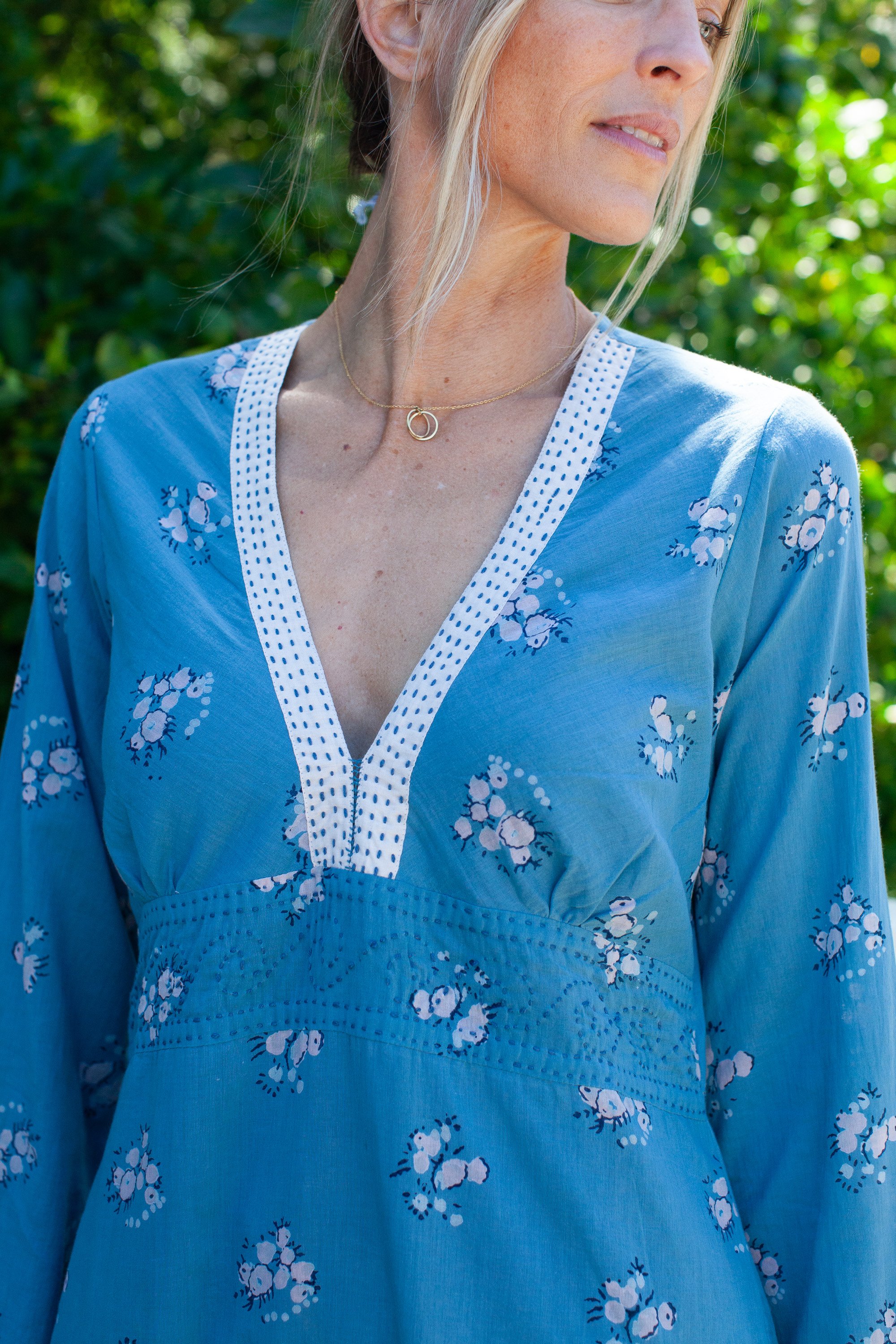 Our lined Midi X Dress hits just above the knee. Appliqué trim on v neckline and cuff with a chunky applique hemline.
