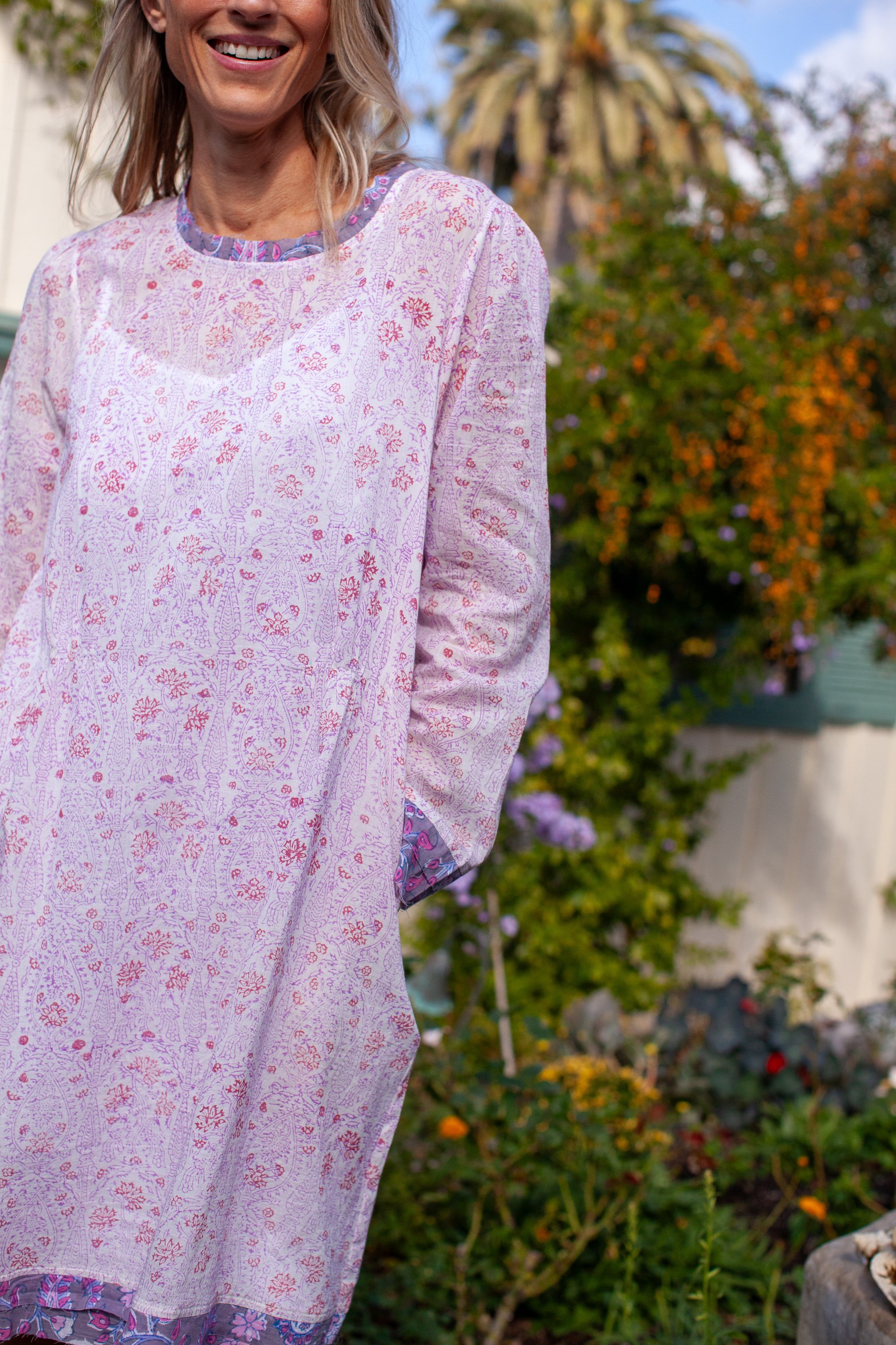 Hitting at the knee, long sleeve easy dress with pockets. Reverse print Lilac Indian Paisley on the hem, cuff and neck line