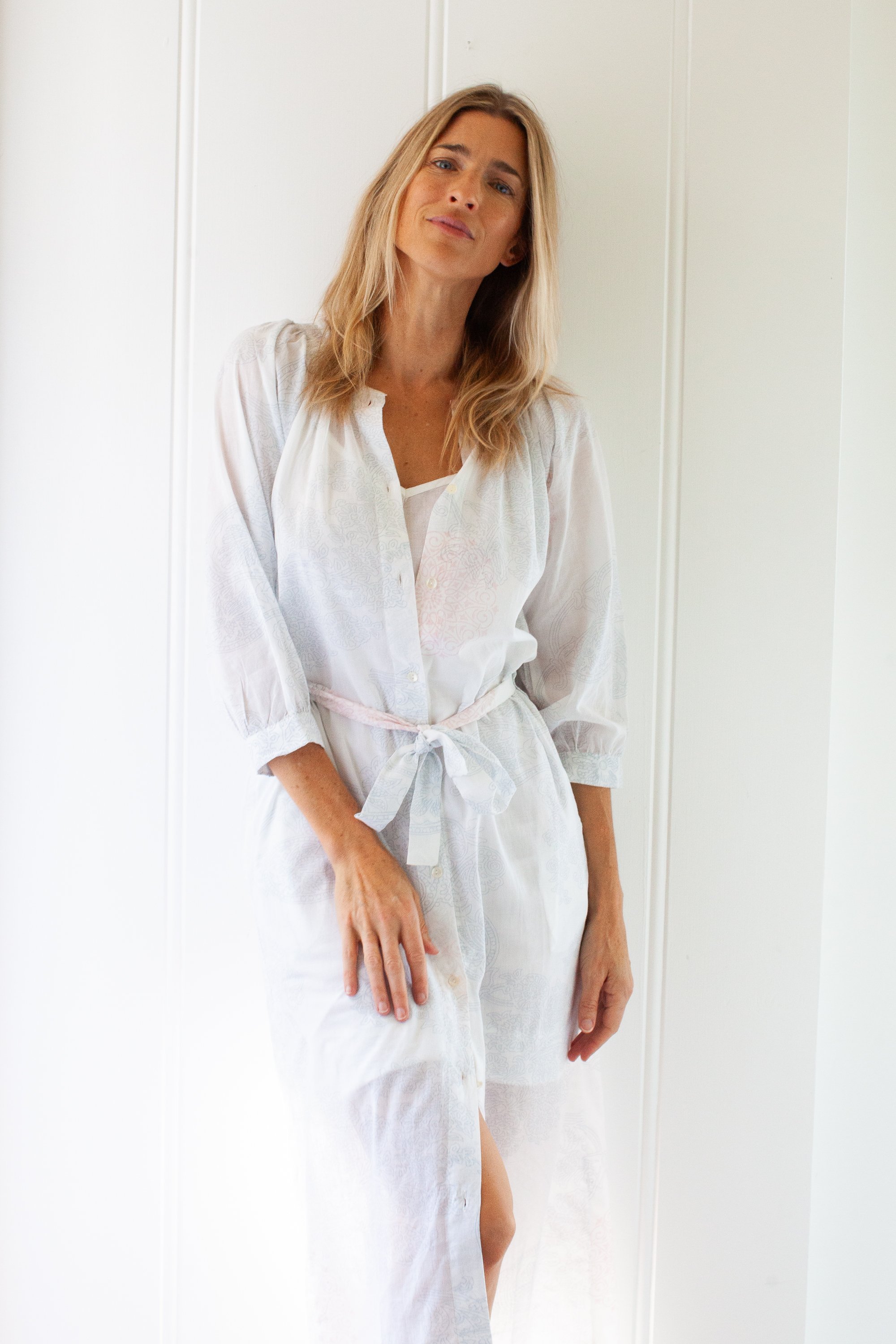 Ruched neckline and button closure. A simple easy to wear dress soft and flowing. Belt closure.