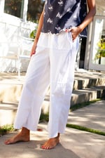 An easy flowing leg with elastic tie waistline make this our classic every day, every night pant. Pockets and raw edge seam. Fabric: Poplin