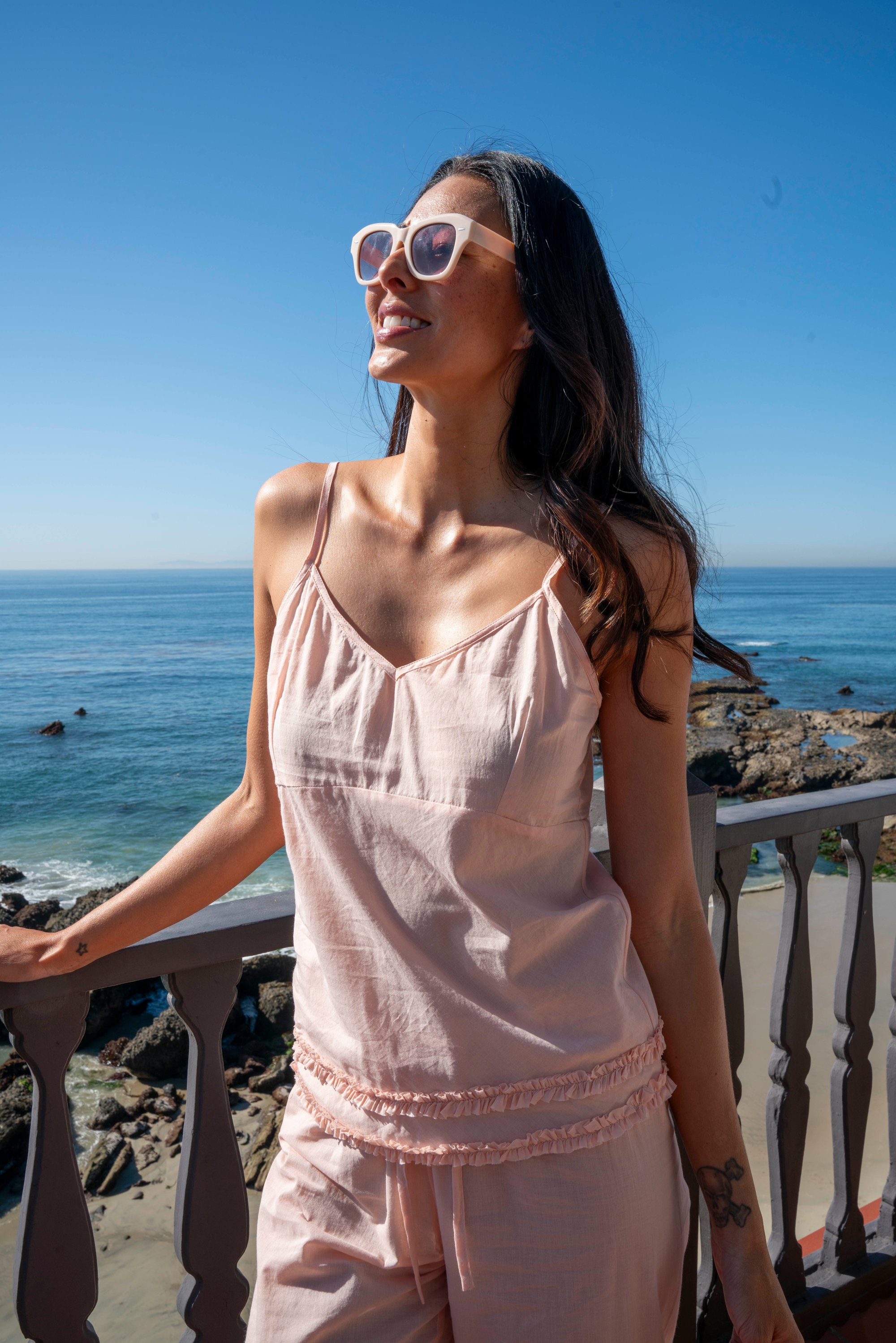 Soft, lightweight camisole with delicate spaghetti straps and a flattering V-neckline. Finished with subtle ruffles and a relaxed fit for effortless, warm-weather styling. Perfect worn alone or layered.