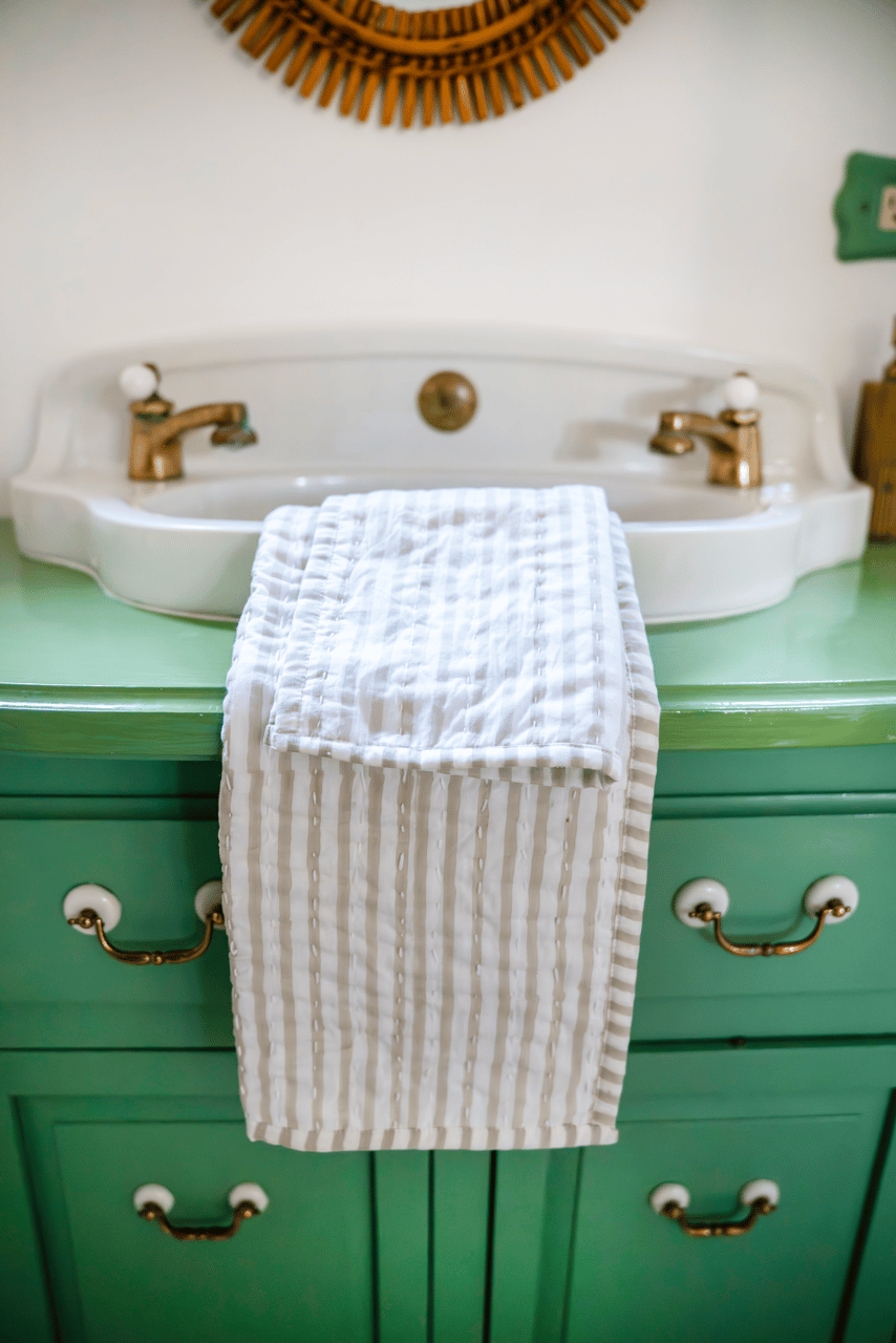 Introducing the Kerry Cassill Terry + Voile Towel, where the luxurious softness of Kerry's bedding now extends to your bath experience. This towel features a combination of solid white terry on one side and the signature Kerry Cassill print on the other, offering both plush comfort and distinctive style. The hand gudri stitching adds a touch of Indian Bohemian charm, elevating the towel to a unique piece of artistry.