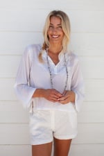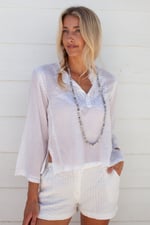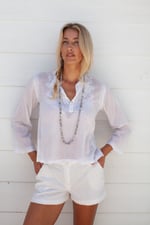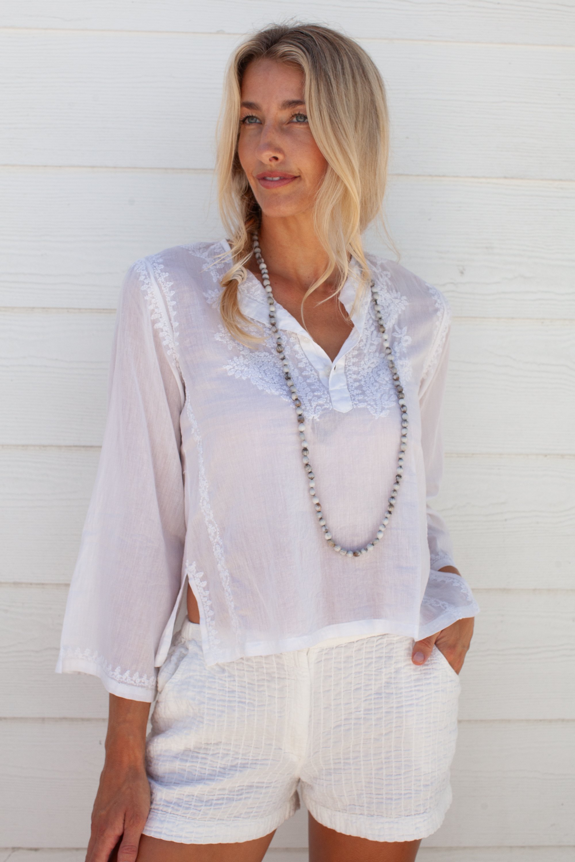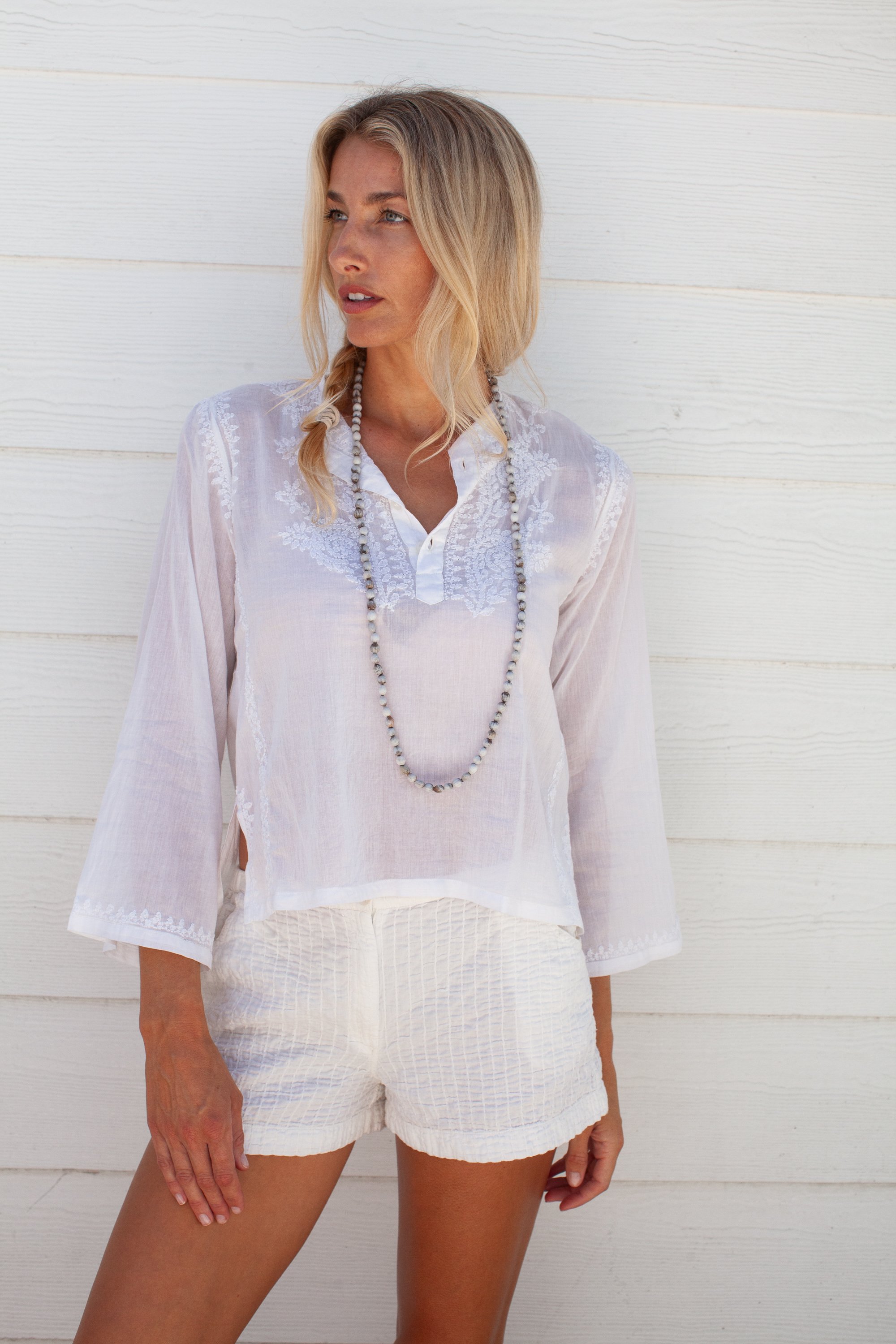 Button closure with hand gudri stitiching running veritcal. Pockets and elastic waistband.